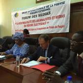 La section UPF de Guinée a organisé à Conakry deux jours de forum sur le thème "la responsabilité des journalistes et des médias en période électorale". Ces journées ont reçu le soutien de l'OIF, qui était représentée au forum par Bertrand Levant, Spécialiste du programme «liberté d’expression et régulation des médias». Jean Kouchner, secrétaire général international de l'UPF y participait également. 35 journalistes ont travaillé et échangé sur le thème, trois semaines avant le premier tour de l'élection présidentielle qui se déroulera le 11 octobre. Le forum a été ouvert par la Présidente de la Haute Autorité de l'Audiovisuelle, l'Ambassadeur de France, L'ambassadeur de l'Union Européenne, (photo)le représentant du Ministre de la Communication, et le président de l'UPF Guinée, Naman Camara.
